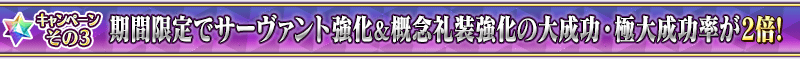 下記の期間中、サーヴァントおよび概念礼装の強化をおこなった際に、大成功(経験値2倍ボーナス)・極大成功(経験値3倍ボーナス)の発生率が期間限定で2倍になります!