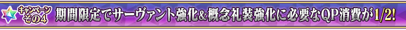下記の期間中、サーヴァントおよび概念礼装を強化する際に必要なQPの消費量が、期間限定で1/2になります!