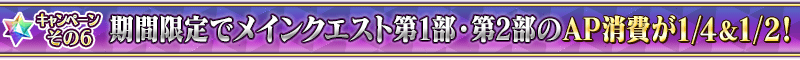 下記の期間中、メインクエスト第1部(特異点Fから終局特異点まで)と第2部(第1章から第3章まで)のAP消費量が1/4、メインクエスト第2部 第4章のAP消費が1/2になります(バトルにおいて撤退した場合でも同様の消費量になります)。