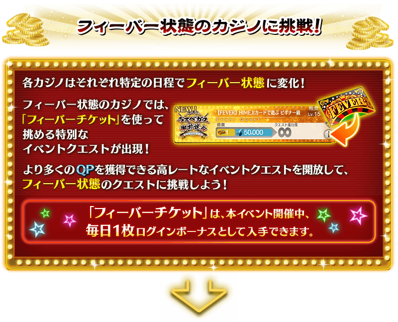 ※フィーバーチケットを受け取れるログインボーナスは、2019年8月14日(水)~9月4日(水)の期間、「特異点F 炎上汚染都市 冬木」をクリアしたマスターが毎日4:00(8月14日(水)のみ18:00)に受け取れます。