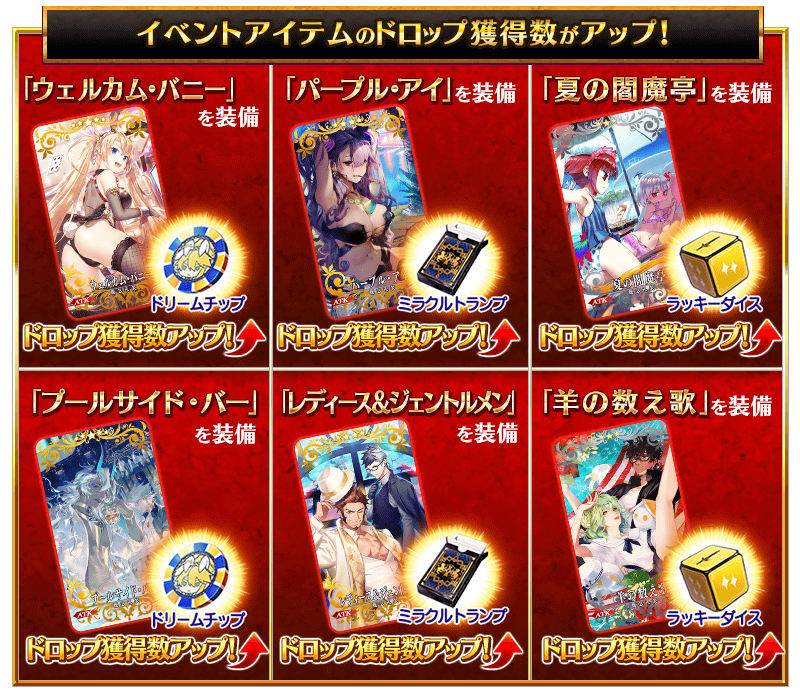 聖晶石召喚にてピックアップされる期間限定概念礼装「ウェルカム・バニー」「パープル・アイ」「夏の閻魔亭」「プールサイド・バー」「レディース&ジェントルメン」「羊の数え歌」を装備することで、イベントアイテム「ドリームチップ」「ミラクルトランプ」「ラッキーダイス」それぞれのドロップ獲得数がアップします。
