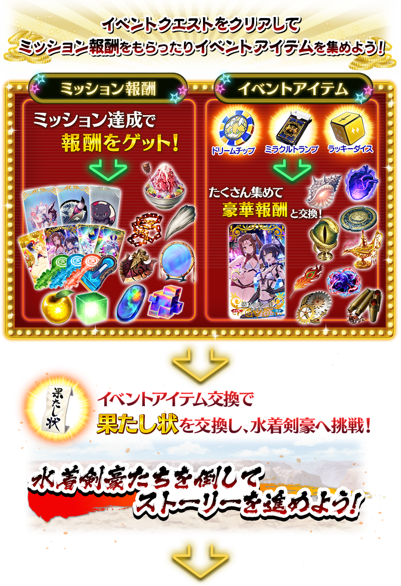 期間限定イベント「見参! ラスベガス御前試合~水着剣豪七色勝負!」では、「QPポイントの累計が一定以上になる」「特定のエネミーを倒す」など、さまざまな条件を達成することで、豪華報酬を獲得できるミッションが発生します!