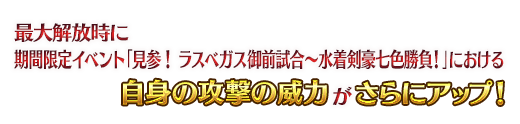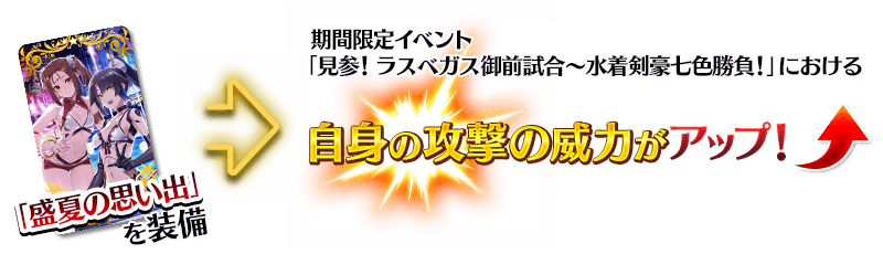 また、イベントアイテム交換で入手できるイベント限定概念礼装「盛夏の思い出」を装備することで、期間限定イベント「見参! ラスベガス御前試合~水着剣豪七色勝負!」のイベントクエストにおける自身の攻撃の威力がアップします。