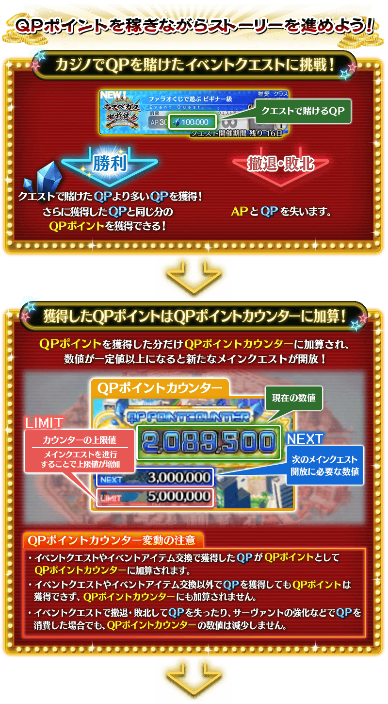 「ビッグチャンスクエスト」は賭けるQPが多いハイリスクハイリターンなクエストです。クリアすることで多くのQPを獲得できるので、しっかり育てたサーヴァントで初回でのクリアを目指しましょう。