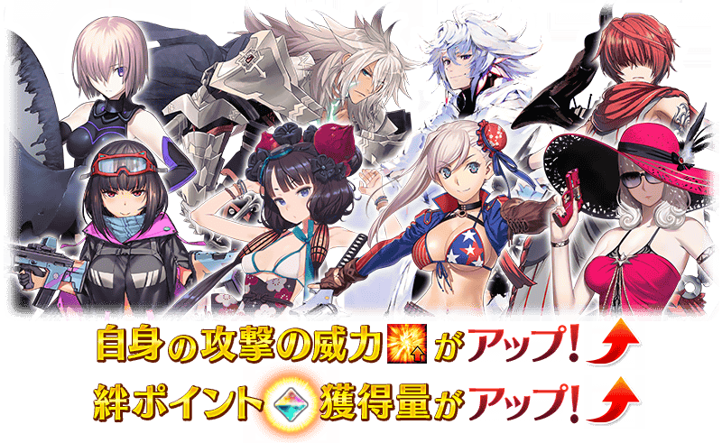 本イベントの期間中、下表のサーヴァントはイベントクエストにおいて「自身の攻撃の威力がアップ」と「絆ポイント獲得量がアップ」のボーナスが得られます!