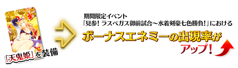 イベントミッション報酬で入手できるイベント限定概念礼装「天鬼姫」を装備することで、クエストに低確率で現れるボーナスエネミーの出現率が15%アップします。