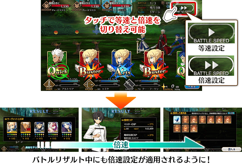 バトルリザルト(バトル終了後のBATTLE FINISH表示、サーヴァントとの絆、獲得EXP、獲得した戦利品の各画面)についても倍速設定が適用されるようにいたします。
