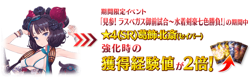 本イベントの期間中は、「★4(SR)葛飾北斎(セイバー)」を強化した際の獲得経験値が2倍になります。