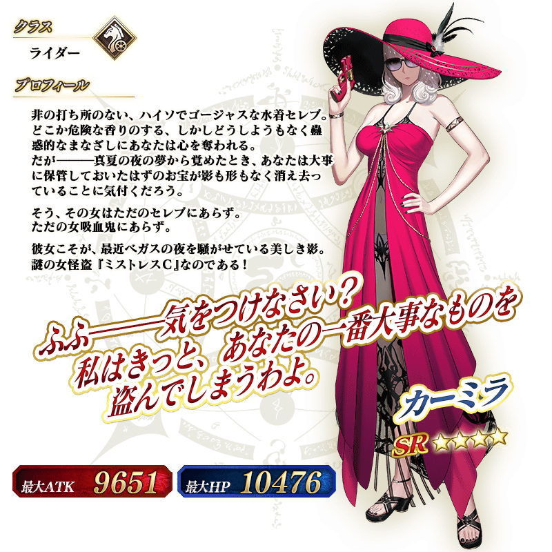 | 8/20(火) 0:00~23:59 | ★5 宮本武蔵(バーサーカー) | ★4 カーミラ(ライダー) |