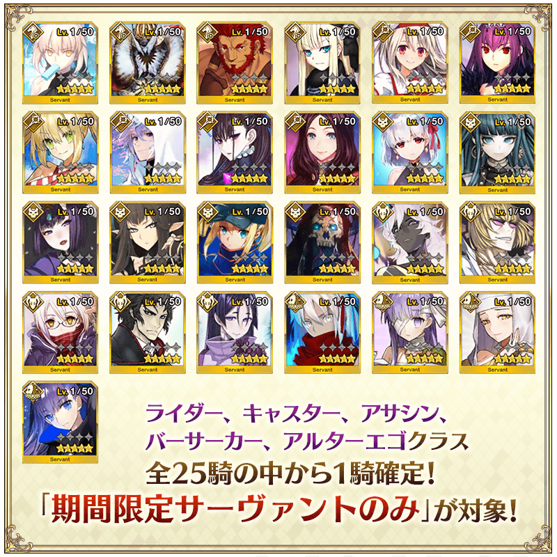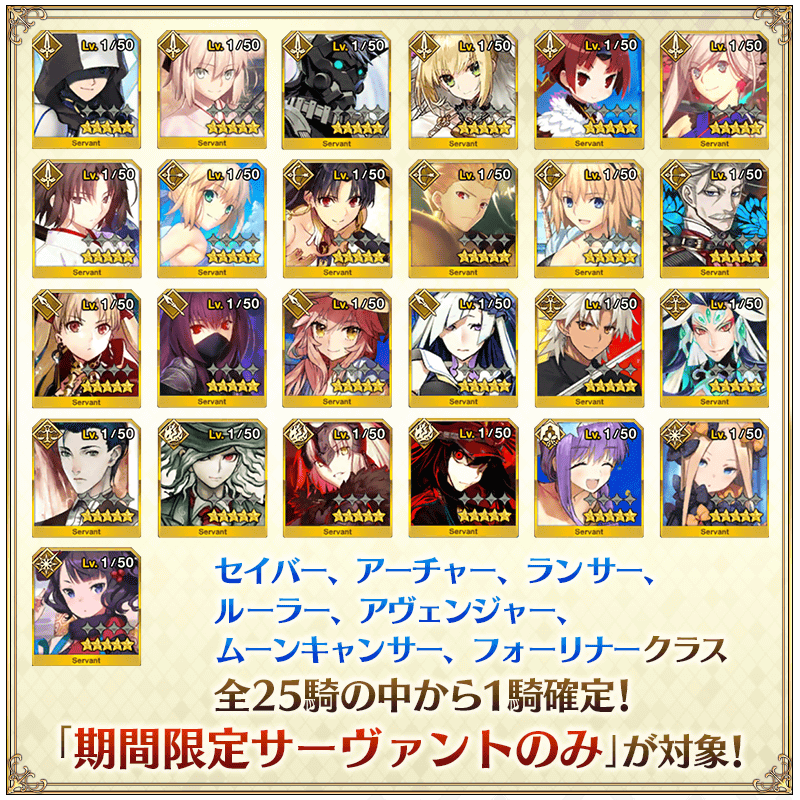 ※召喚対象には★5(SSR)サーヴァント1騎確定以外に、一部の★4(SR)、★3(R)サーヴァントおよび概念礼装も含まれます。