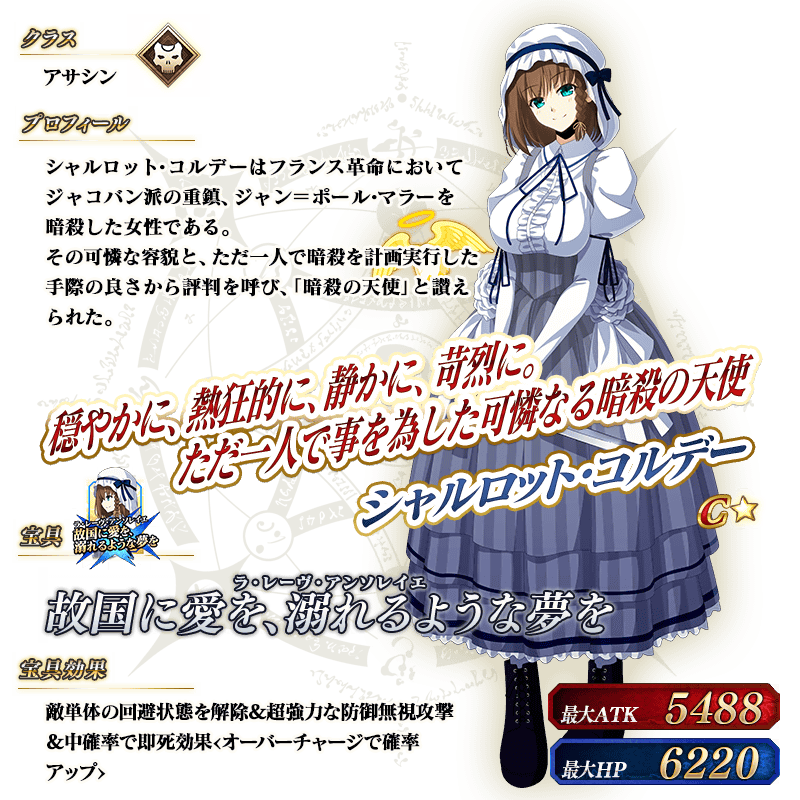 ※上記の「★1(C)シャルロット・コルデー」のイラストは霊基再臨第2段階のものです。
