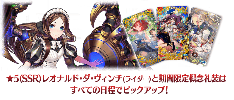 今回のピックアップでは、第2部第1章~第3章を代表するサーヴァント達と、亜種特異点Ⅰ~Ⅳまでを代表するサーヴァント達を日替りで、「★5(SSR)レオナルド・ダ・ヴィンチ(ライダー)」と期間限定概念礼装「★5(SSR)ウォーク・イン・ザ・パーク」「★4(SR)モーニング・グローリー」「★3(R)サンデー・ディナー」を常時ピックアップいたします!