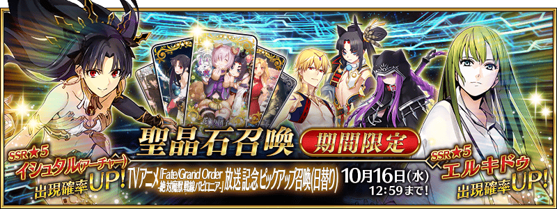 ※『TVアニメ「Fate/Grand Order -絶対魔獣戦線バビロニア-」放送記念ピックアップ召喚(日替り)』は日替りとなり、「★5(SSR)イシュタル(アーチャー)」はピックアップ期間中でも排出されない日がありますので、ご注意ください。