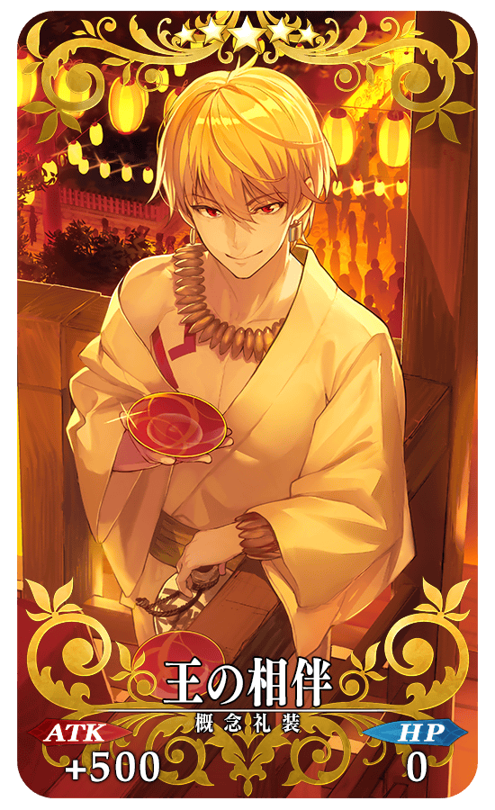 ※2019年10月5日(土) 0:00~10月7日(月) 23:59、10月11日(金) 0:00~10月12日(土) 23:59、10月15日(火) 0:00~10月16日(水) 12:59の間は、「★5(SSR)王の相伴」「★5(SSR)熱砂の語らい」「★5(SSR)真夏のひと時」は排出されませんのでご注意ください。