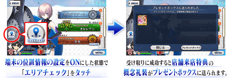 通信の状態が不安定な場合や、位置情報の設定がOFFに設定されている場合は、「店舗来店特典」概念礼装が上手く入手できない場合がございます。