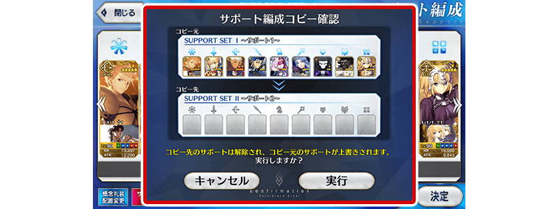 サポート編成画面にて、選択したサポートセットを他のセットにコピーできる機能を追加いたします。また「サポート名をクリアして解散」もおこなえるようになります。