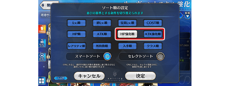 サーヴァントを選択する際の、HP強化順・ATK強化順でのソートを、パーティ編成やサーヴァントスキル強化などの画面にも拡張いたします。