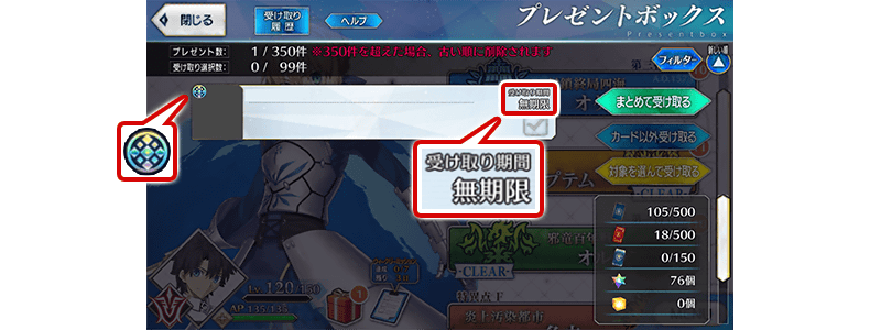 プレゼントボックス内の霊衣開放権や絆礼装などの一部重要なプレゼントにおける受け取り期間を無期限に変更いたします。また絆礼装においてはそれを示すアイコン表示を追加いたします。 ※本変更以前からのプレゼントボックス内プレゼントにも適用されます。