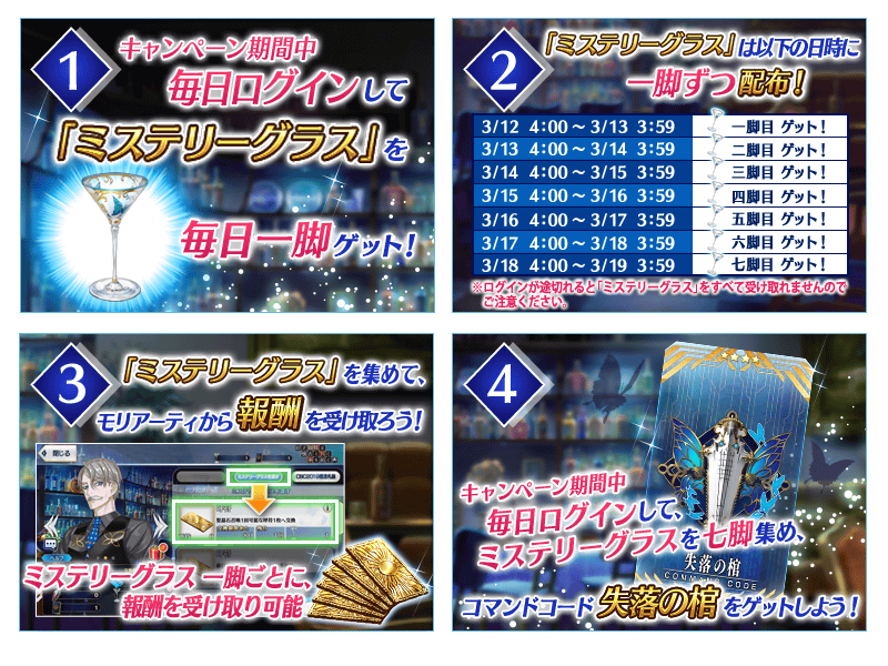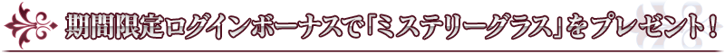 ※各ログイン日時の期間内でログインできなかった場合には「ミステリーグラス」を受け取ることができませんのでご注意ください。