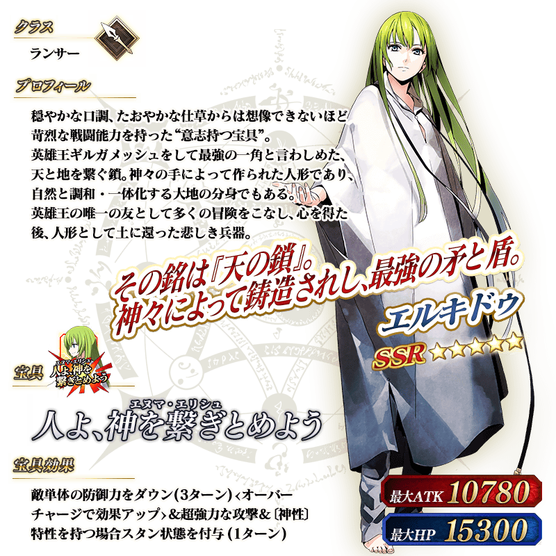 ※上記の「★5(SSR)エルキドゥ」のイラストは霊基再臨第2段階のものです。