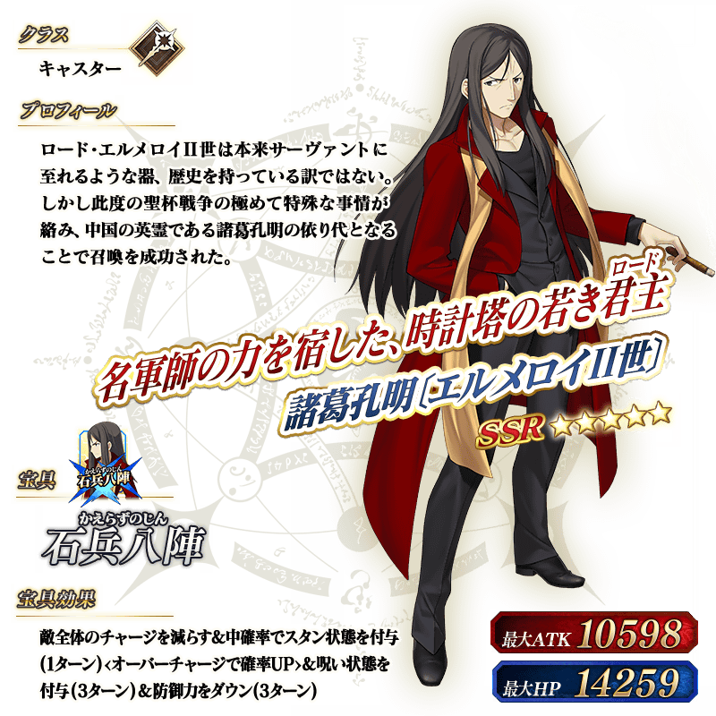 ◆サーヴァントに関するご注意◆ ※新宿のアーチャー(ジェームズ・モリアーティ)はピックアップ召喚期間終了後、ストーリー召喚には追加されません。 ※章の進行により追加される男性サーヴァントは、章クリア前でも入手可能です。 ※オリオン、エルキドゥ、シュヴァリエ・デオン、アストルフォも排出対象に含まれます。 ※日替りでピックアップされる★5(SSR)男性サーヴァント、蘭陵王、新宿のアサシン(燕青)、アレキサンダーは、ピックアップ期間終了後もストーリー召喚にて排出されます。 ※真名隠し対象サーヴァントについては、メインクエストの進行度によってサーヴァントおよび一部宝具の名称が変化いたします。