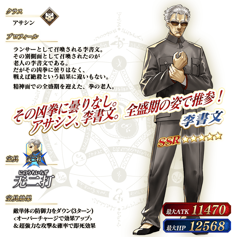 ※上記の「★5(SSR)李書文(アサシン)」のイラストは霊基再臨第2段階のものです。