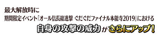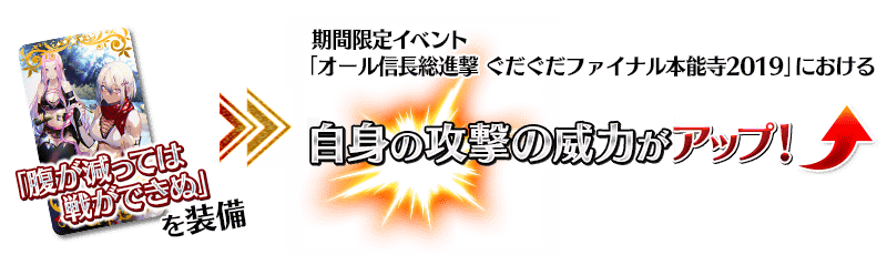 イベントアイテム交換で入手できるイベント限定概念礼装「腹が減っては戦ができぬ」を装備することで、期間限定イベント「オール信長総進撃 ぐだぐだファイナル本能寺2019」のイベントクエストにおける自身の攻撃の威力がアップします。