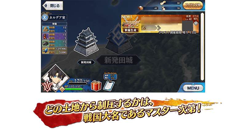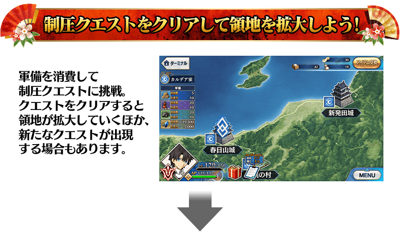 生産した軍備を消費することで制圧クエストが実行できます。クエストのクリアで領地を拡げられ、天下統一へと近付いていきます。また、制圧クエストをクリアできなかった場合、軍備は消費されません。