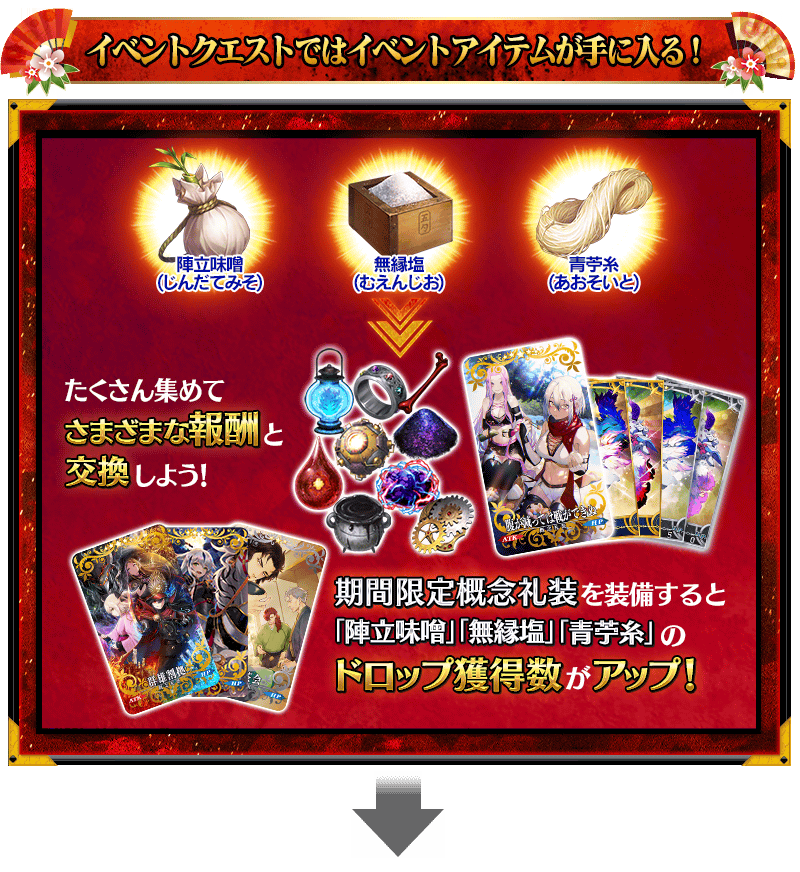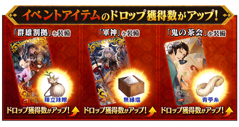 聖晶石召喚にてピックアップされる期間限定概念礼装「群雄割拠」「軍神」「鬼の茶会」を装備することで、イベントアイテム「陣立味噌」「無縁塩」「青苧糸」それぞれのドロップ獲得数がアップします。