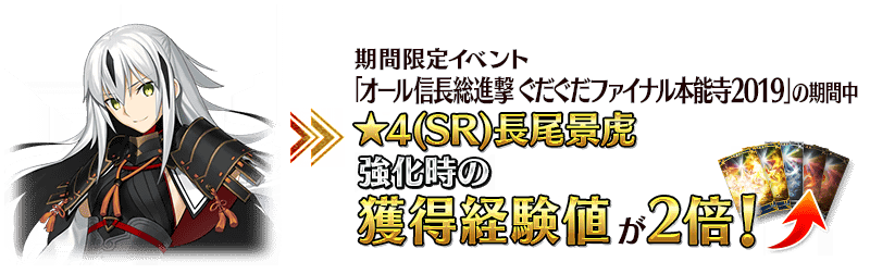 本イベントの期間中は、「★4(SR)長尾景虎」を強化した際の獲得経験値が2倍になります。