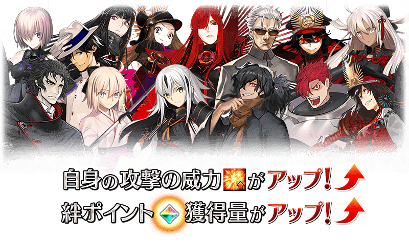 本イベントの期間中、下表のサーヴァントはイベントクエストにおいて「自身の攻撃の威力がアップ」と「絆ポイント獲得量がアップ」のボーナスが得られます!