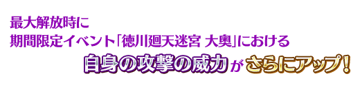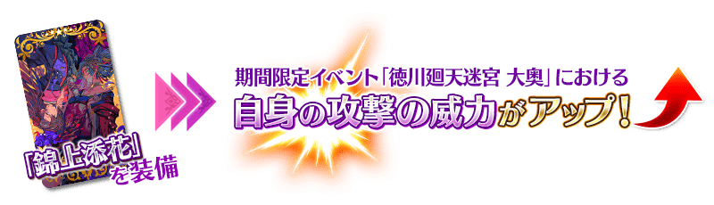 イベントアイテム交換で入手できるイベント限定概念礼装「錦上添花」を装備することで、期間限定イベント「徳川廻天迷宮 大奥」のイベントクエストにおける自身の攻撃の威力がアップします。