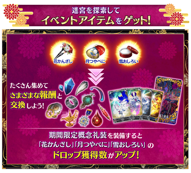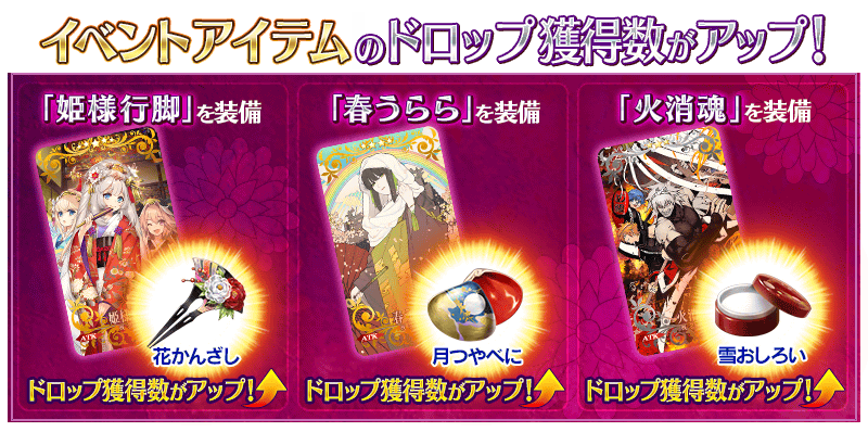 聖晶石召喚にてピックアップされる期間限定概念礼装「姫様行脚」「春うらら」「火消魂」を装備することで、イベントアイテム「花かんざし」「月つやべに」「雪おしろい」それぞれのドロップ獲得数がアップします。