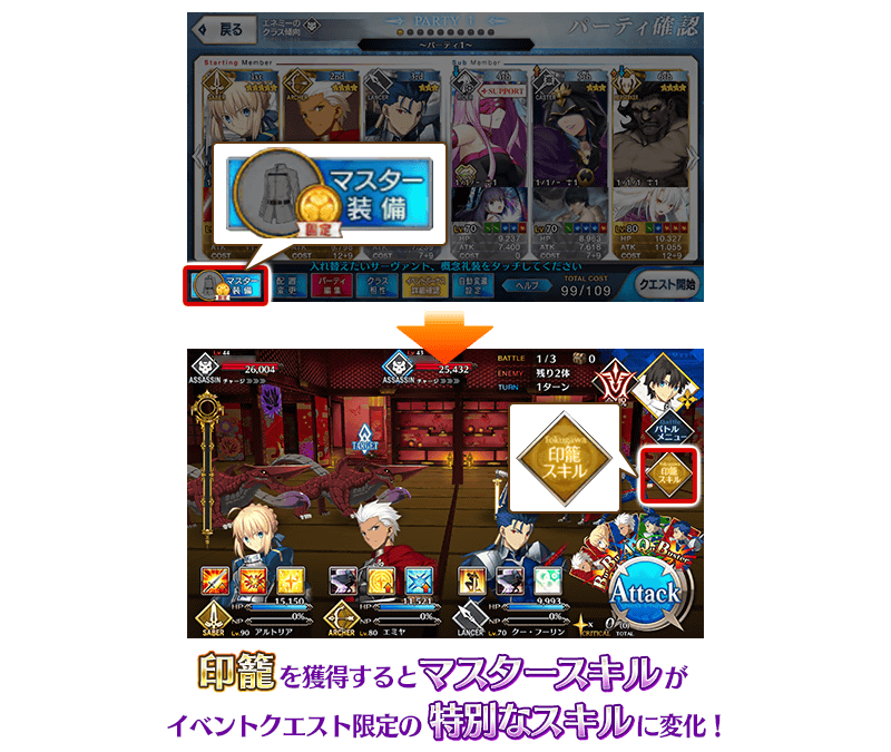 「印籠」を入手後は、イベントクエストのバトル中に使用できるマスタースキルが、魔術礼装のものではなく「印籠」独自のものに変化します。