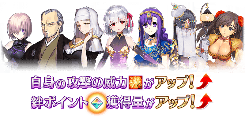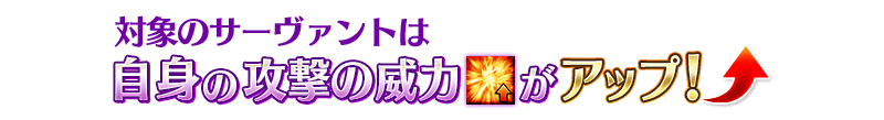 本イベントの期間中、イベントボーナス対象のサーヴァントはイベントクエストにおいて「自身の攻撃の威力がアップ」のボーナスが得られます。