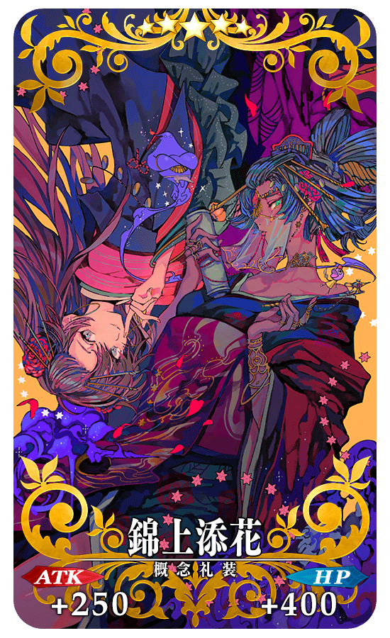 イベントアイテム交換で入手できるイベント限定概念礼装「錦上添花」を装備することで、期間限定イベント「徳川廻天迷宮 大奥」のイベントクエストにおける自身の攻撃の威力がアップします。