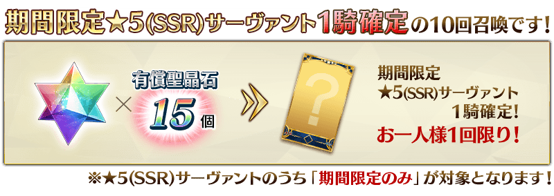 期間限定★5(SSR)サーヴァント1騎確定、★4(SR)以上1枚確定、★3(R)以上のサーヴァント1騎確定!