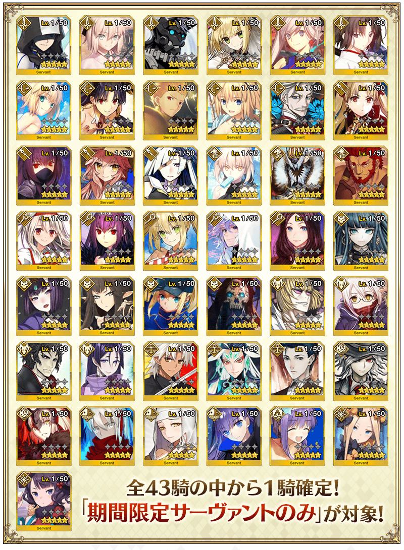 ※召喚対象には★5(SSR)サーヴァント1騎確定以外に、一部の★4(SR)、★3(R)サーヴァントおよび概念礼装も含まれます。