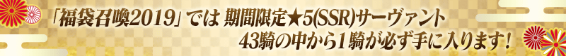 ※「福袋召喚2019」から排出される★5(SSR)サーヴァントは2018年までに登場した期間限定サーヴァントのみが対象となり、ストーリー召喚から排出される★5(SSR)サーヴァントは排出されません。