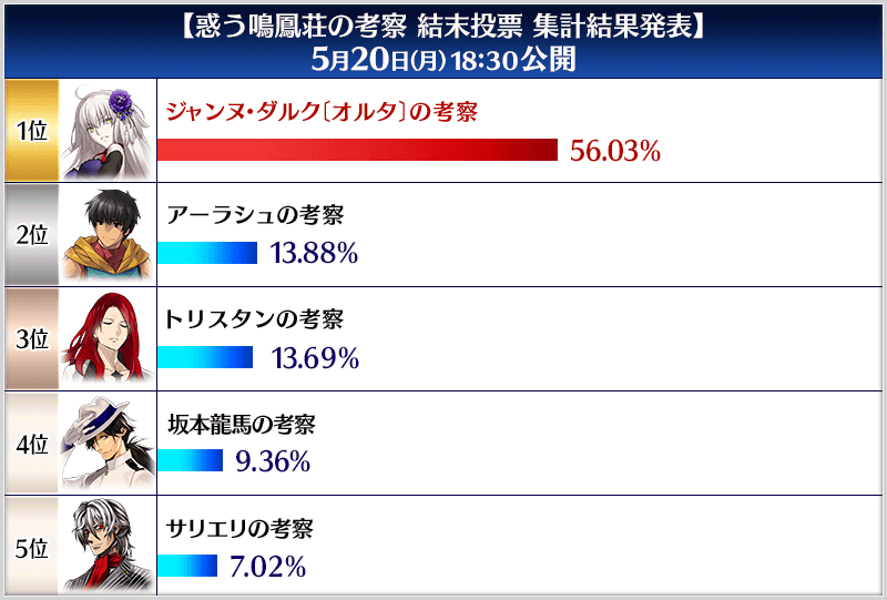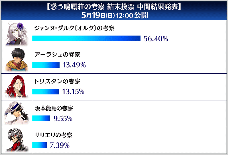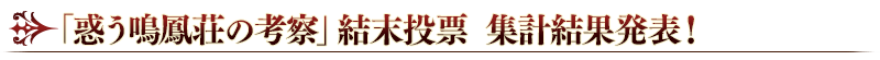 5月18日(土) 18:00より開始しております、期間限定イベント「惑う鳴鳳荘の考察」の結末投票に関しまして、投票数の中間結果を発表いたします。