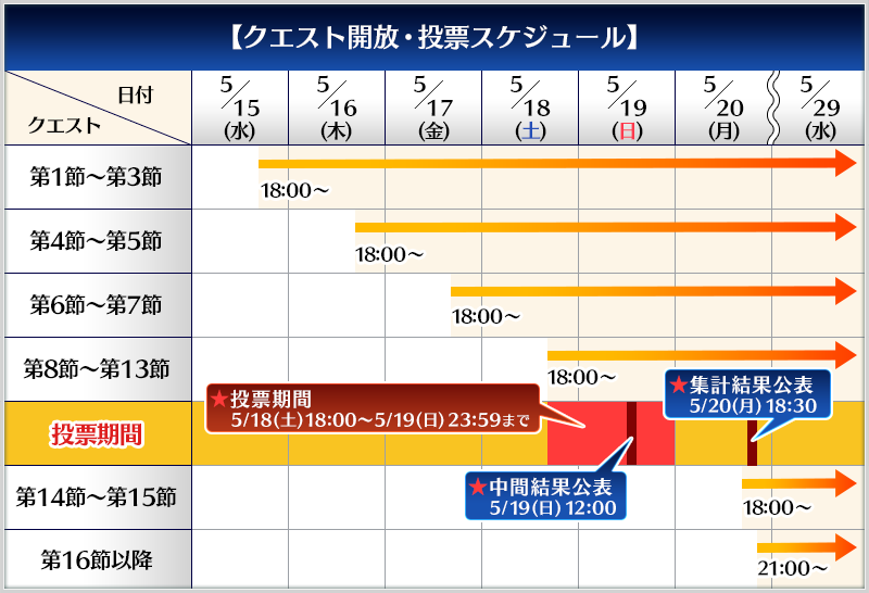 また、5月18日(土) 18:00よりメインクエスト「第8節」~「第13節」の開放とともに、物語の展開をマスターのみなさまで決める投票をゲーム内にておこないます。