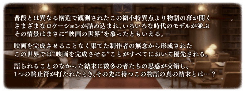 今は亡き映画監督の無念をはらすためカルデアより選ばれし新たな監督とキャストを引き連れ、未完の映画を完成させましょう!