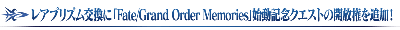 ※「レアプリズムを交換」に追加される「Fate/Grand Order Memories」始動記念クエスト開放権は恒常となり、交換期限はありません。 ※既に交換対象のクエストをクリアされている方については、残り回数の表示が「0回」となり、交換することができません。 ※クエストクリアにて入手した限定概念礼装のレベルは最大となります。 ※「Fate/Grand Order Memories」始動記念クエストにアドベンチャーパートはありませんのでご注意ください。