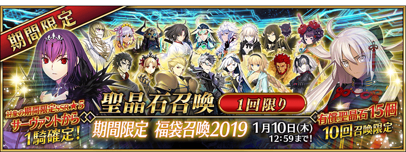 | 1月12日(土) AM0:00~23:59 | スカサハ(ランサー) 「ニューイヤー2019ピックアップ召喚」限定概念礼装 |