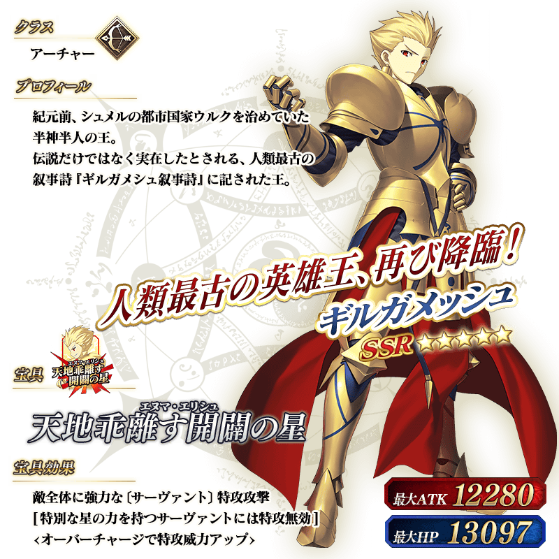 ※上記の「★5(SSR)ギルガメッシュ(アーチャー)」のイラストは霊基再臨第2段階のものです。
