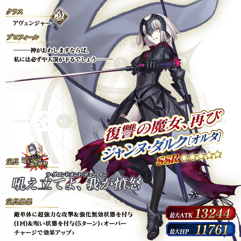 ※上記の「★5(SSR)ジャンヌ・ダルク〔オルタ〕(アヴェンジャー)」のイラストは霊基再臨第2段階のものです。