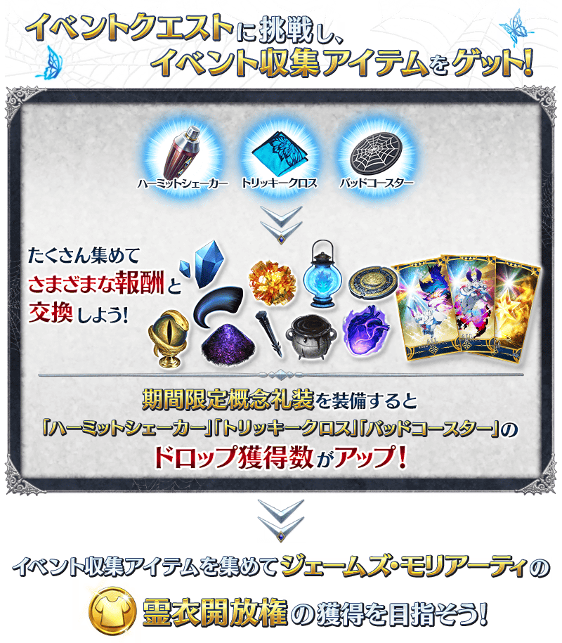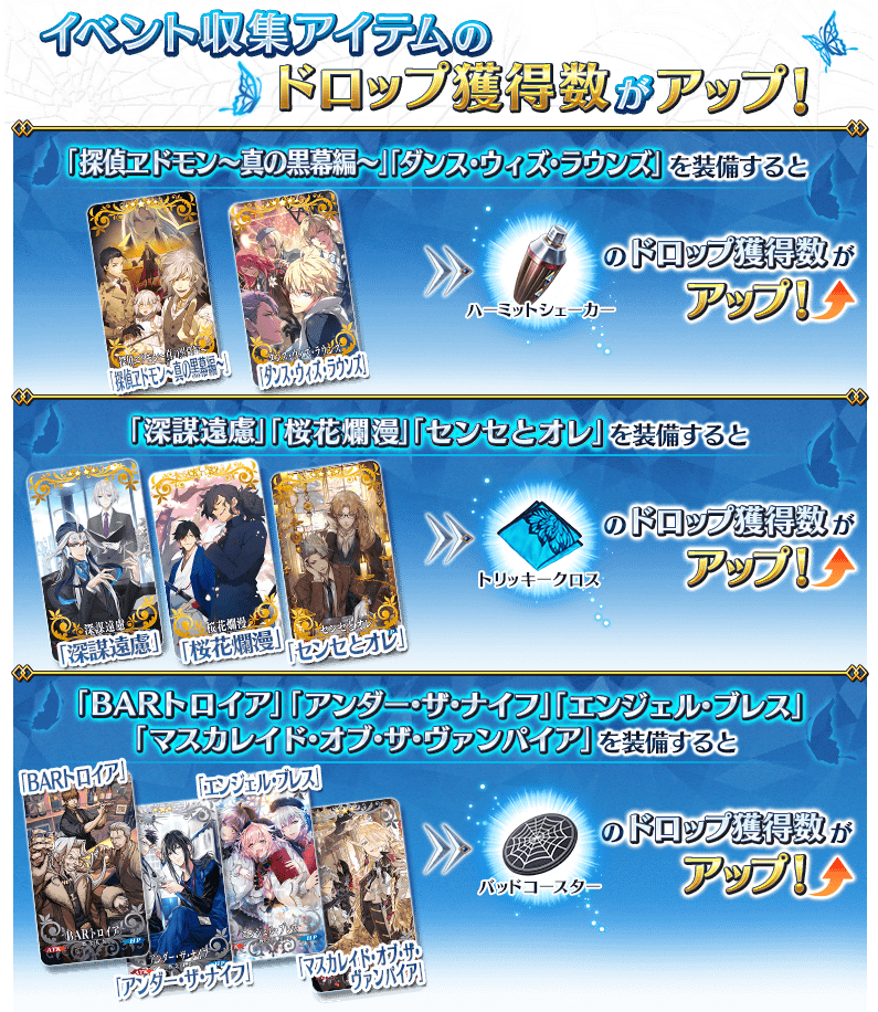 聖晶石召喚にてピックアップされる期間限定概念礼装「探偵ヱドモン~真の黒幕編~」「ダンス・ウィズ・ラウンズ」「深謀遠慮」「桜花爛漫」「センセとオレ」「BARトロイア」「アンダー・ザ・ナイフ」「エンジェル・ブレス」「マスカレイド・オブ・ザ・ヴァンパイア」を装備することで、イベント収集アイテム「ハーミットシェーカー」「トリッキークロス」「バッドコースター」それぞれのドロップ獲得数がアップします。