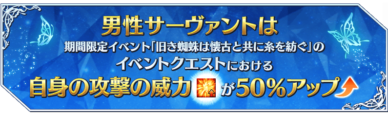 本イベントの期間中、すべての男性サーヴァントはイベントクエストにおいて、自身の攻撃の威力が50%アップのボーナスが得られます!