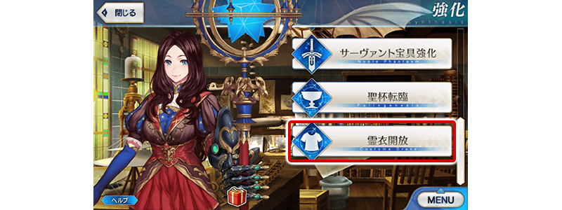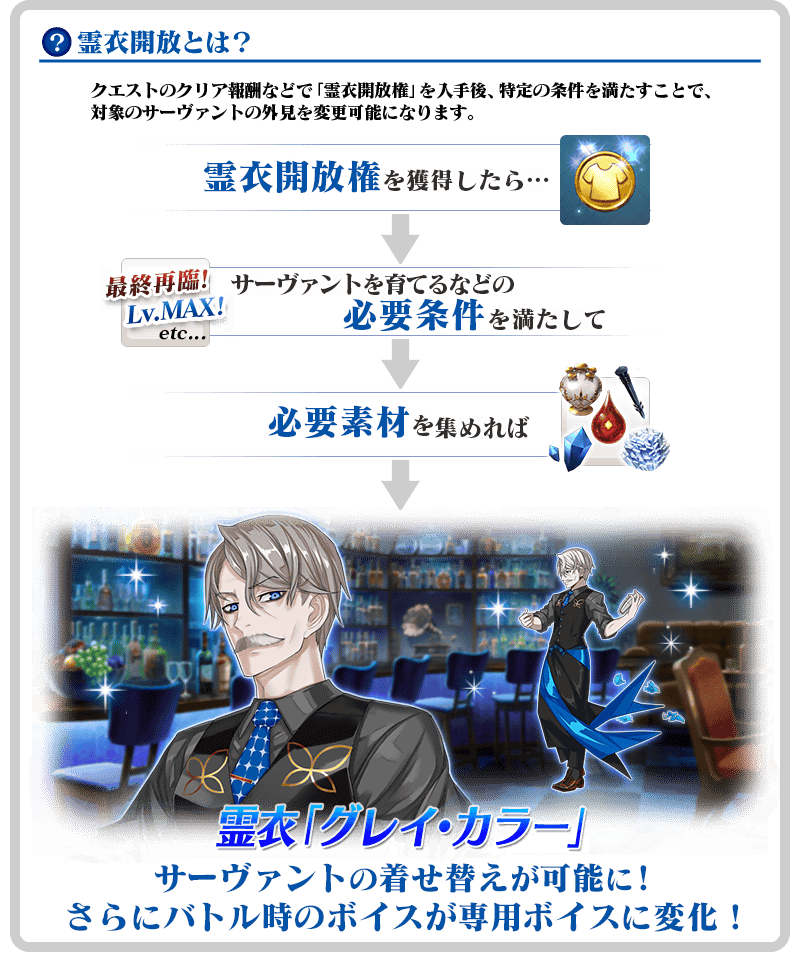 ※「霊衣開放」後は自動でバトルキャラやアイコンが切り替わります。「霊衣開放」前の状態に戻したい場合や、他の再臨段階に変更したい場合は、サーヴァント詳細画面より変更することができます。 ※「霊衣開放」による変更はサーヴァントの外見やボイスのみで、クラスやパラメータなどに変化はありません。 ※一部のボイスは変化しませんのでご注意ください。