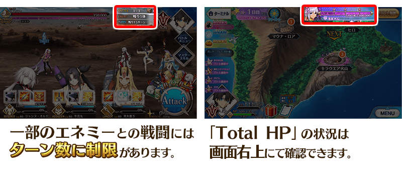 バトルは、「通常のHPを0にする」「制限ターン数の経過」「バトルに敗北」のいずれかで終了し、最終的に「Total HP」を0にすればエネミーを倒せます。